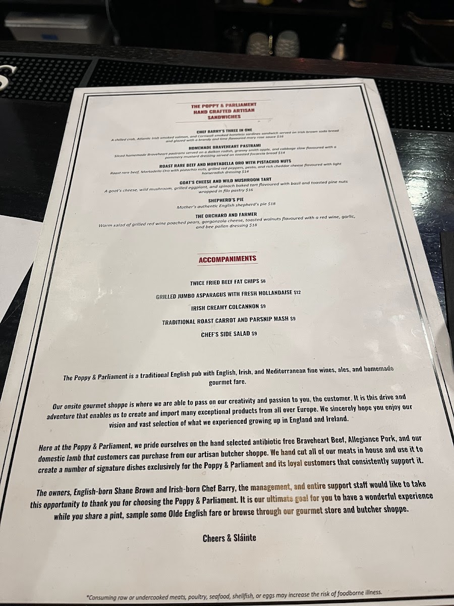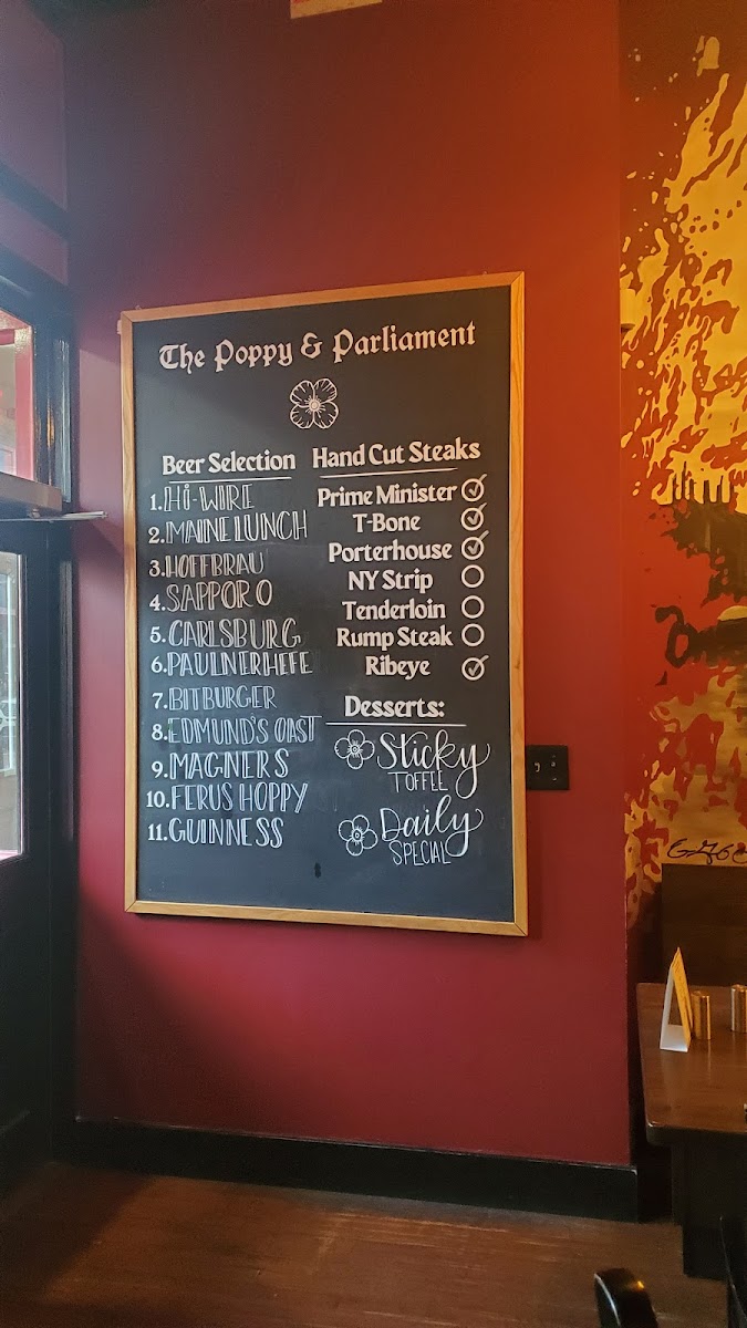 The menu also features a variety of appetizing tapas, like French Onion Soup and Mushrooms on Toast. The expertly crafted cocktails, such as the Margarita and Negroni, provide a refreshing complement to your meal. Each visit promises friendly service and a lively atmosphere, making The Poppy and Parliament a must-visit for anyone craving a true taste of the UK and Ireland.
